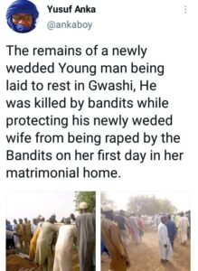 A young man was reportedly killed by suspected bandits in Zamfara while trying to stop the gunmen from raping his newly wedded wife on their wedding night.