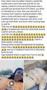 The woman, named Ebere, was set allegedly ablaze by her husband, according to a friend of hers mourning her on Facebook.
