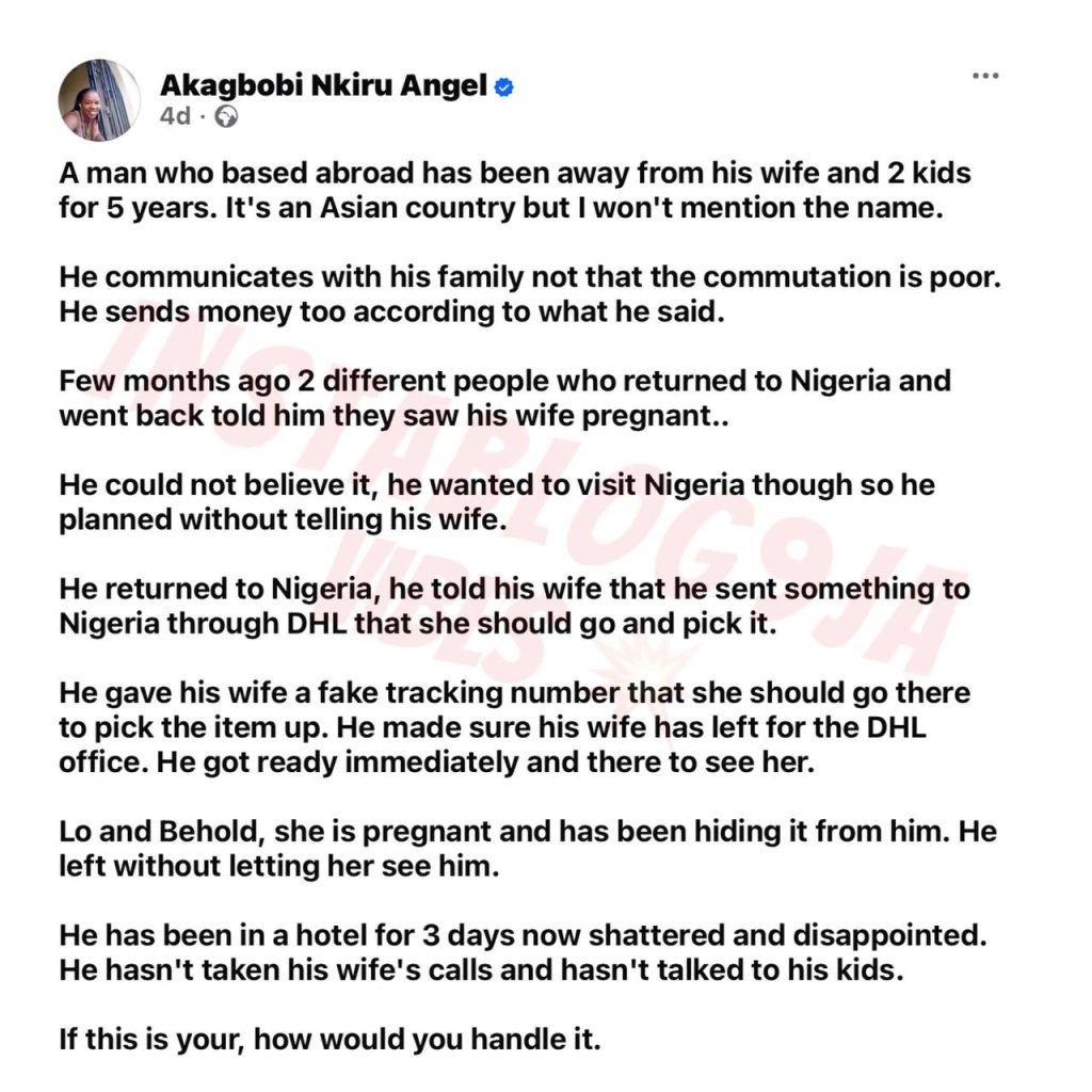 The situation took a turn when two individuals who visited Nigeria and later returned abroad informed him that they saw his wife heavily pregnant. Doubtful but concerned, he decided to return to Nigeria secretly to verify the claim.