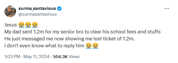 According to the individual identified online as @surma_santavious, his father sent his senior brother N1.2 million to cover his school tuition and other expenses, but the senior brother never utilised it.