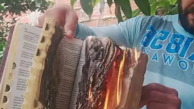 In the footage, the 47-year-old flicked a lighter at the Bible and said: “This here is a Bible, which they say is sacred. Look what it does when faced with fire. It burns.”