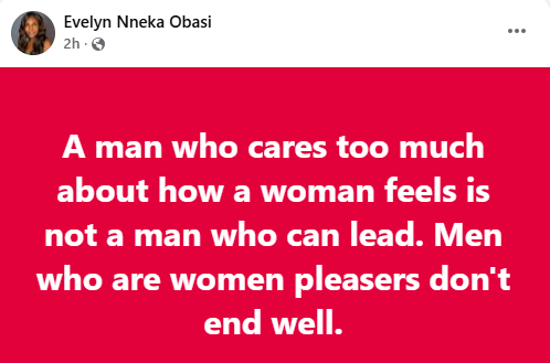 “A man who cares too much about how a woman feels is not a man who can lead. Men who are women pleasers don’t end well,” she wrote in a Facebook post on Friday.