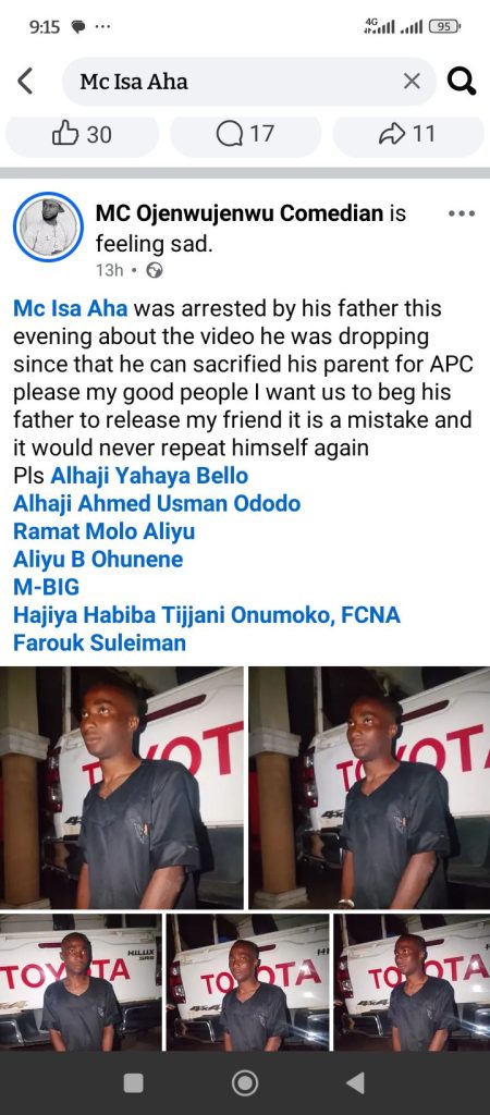 “Mc Isa Aha was arrested by his father this evening about the video he was dropping since that he can sacrifice his parent for APC.
