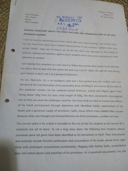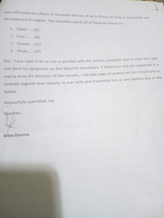The man towards the tail-end of the letter identified the seniors who have been bullying his son. He gave their names as David, Paul, Charles, and Ebuka all in senior secondary school two.