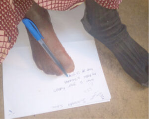 According to her, she often puts a pen in between her toes to write and, usually, whenever she was asked a question either in writing or orally, she would respond either in writing or an action.