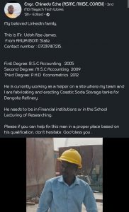 His story was shared on LinkedIn by Engr Chinedu Eche who solicited for help for the man with a PhD in Econometrics, Masters and Bachelors degree in Accounting.