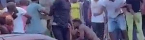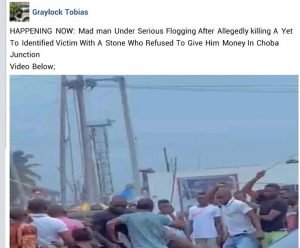 A man said to be mentally-challenged was beaten to a pulp by an angry for allegedly stabbing a young man in Port Harcourt, Rivers State.