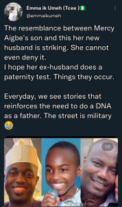 Placing their pictures side by side, a tweep, @emmaikumeh, said, “The resemblance between Mercy Aigbe’s son and her new husband is striking. She cannot even deny it.