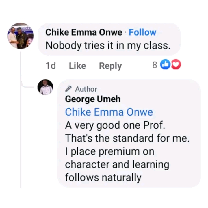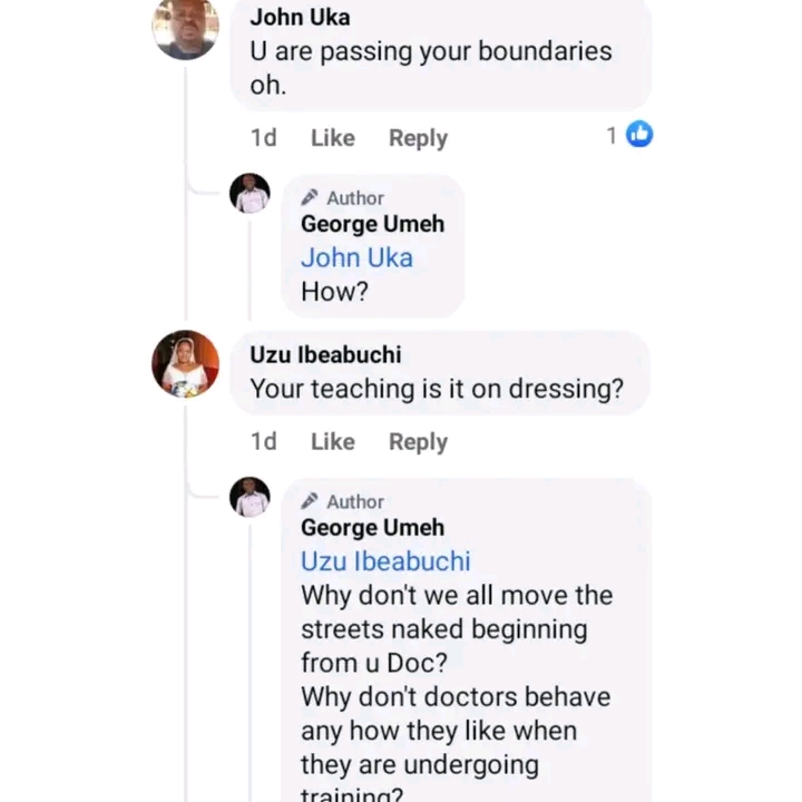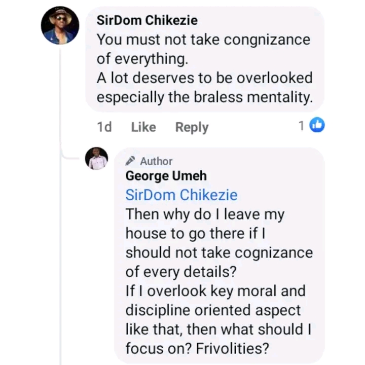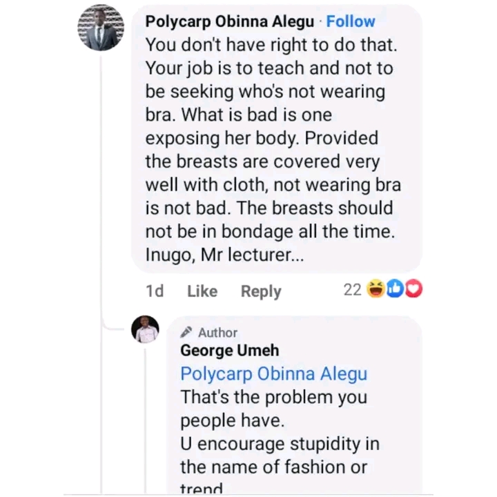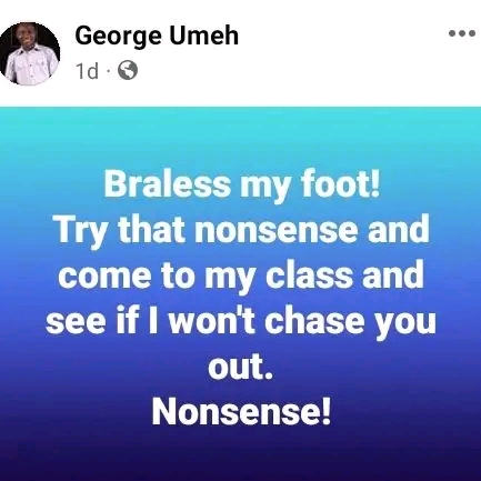 Reacting to the post by George Umeh, a lecturer with the Alex Ekwueme University, Ndufu-Alike, Ikwo (AE-FUNAI) Ebonyi State, some of his followers commended him for taking a stand against indecent dressing, While others said that he has no right to kick students out of the class for not wearing bras.