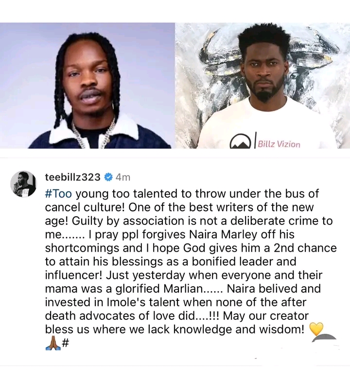 He wrote; “#Too young too talented to throw under the bus of cancel culture! One of the best writers of the new age! Guilty by association is not a deliberate crime to me……. I pray ppl forgives Naira Marley off his shortcomings and I hope God gives him a 2nd chance to attain his blessings as a bonified leader and influencer! Just yesterday when everyone and their mama was a glorified Marlian…… Naira belived and invested in Imole’s talent when none of the after de th advocates of love did….!!! May our creator bless us where we lack knowledge and wisdom!”