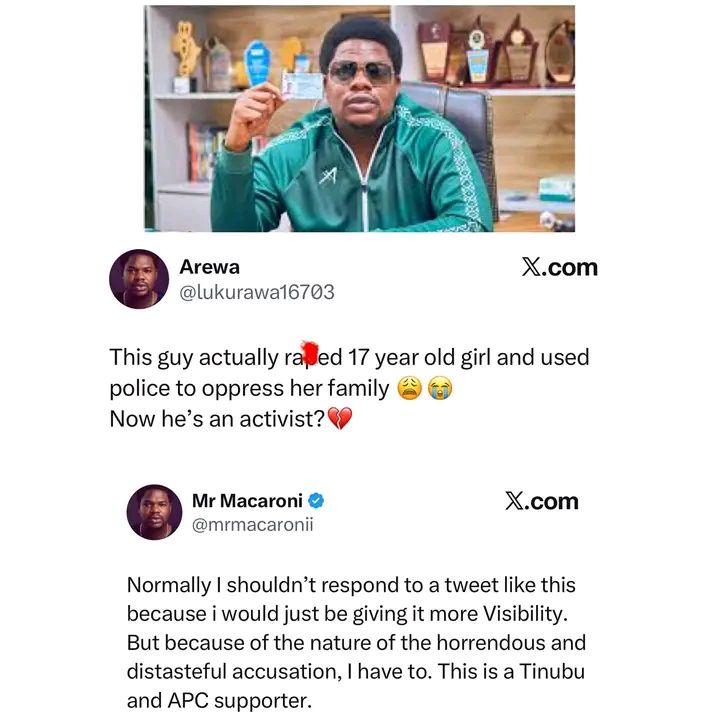 Reacting via his X handle, Mr Macaroni wrote‘’Normally I shouldn’t respond to a tweet like this because i would just be giving it more Visibility. But because of the nature of the horrendous and distasteful accusation, I have to. This is a Tinubu and APC supporter.