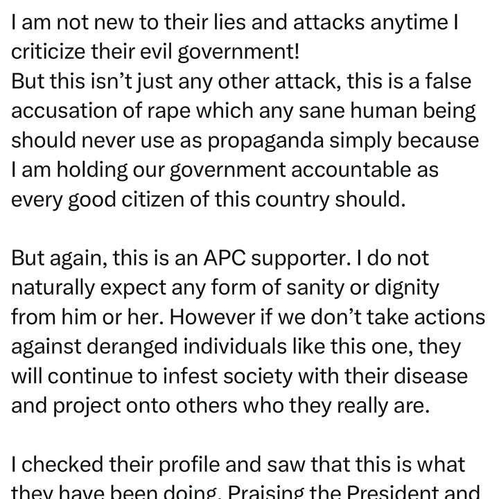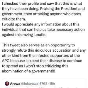This tweet also serves as an opportunity to strongly refute this ridiculous accusation and any other kind from the infested supporters of the APC because I expect their disease to continue to spread as I won’t stop criticizing this abomination of a government!!!”