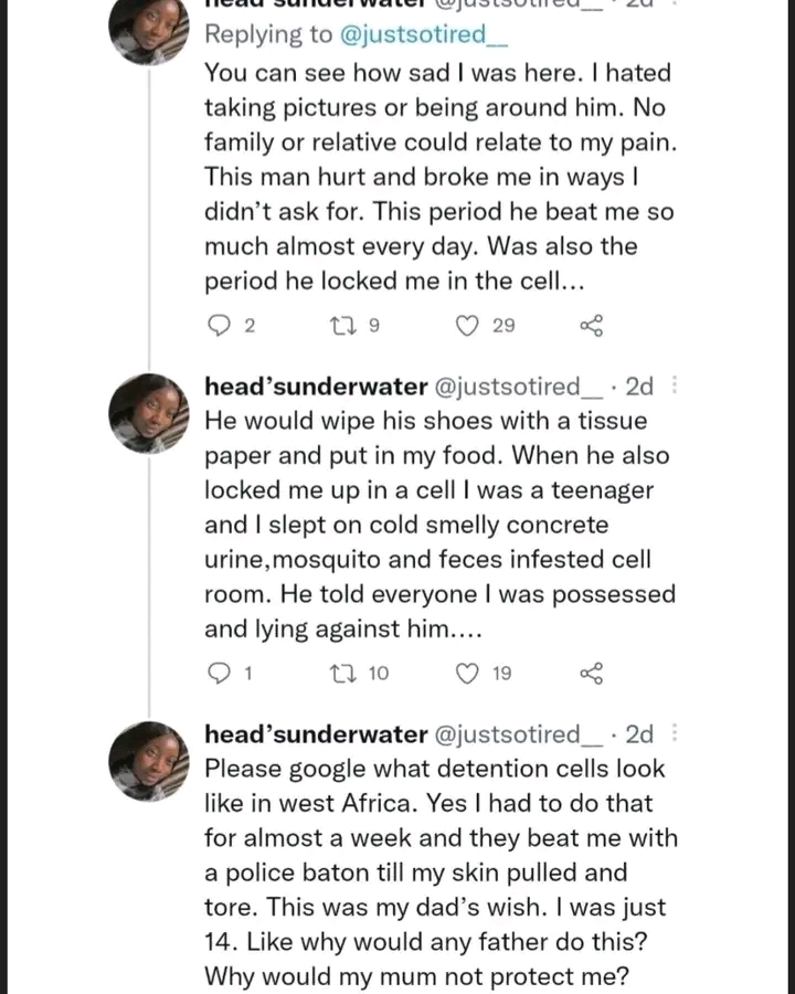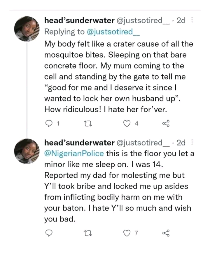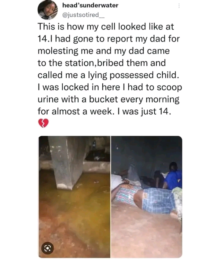 She added that when she went to the police to report at age 14, they locked her up in a cell. She shared photos of her cell as proof.