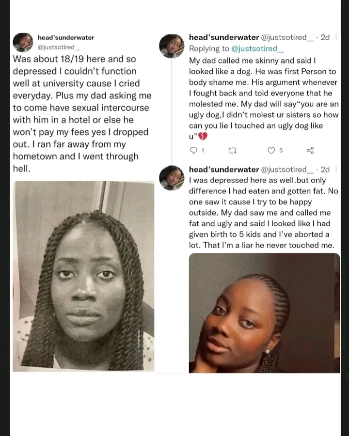 She also revealed that she had to drop out of the university when her dad would insist she meets him in a hotel for sex before he would give her the money she needs for school.