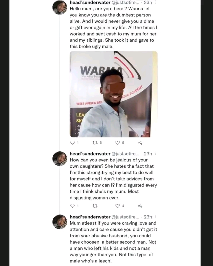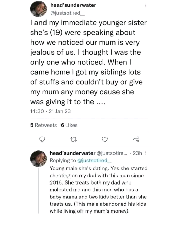 She said her mother was jealous of her and her sister and began cheating on her father with a younger man.