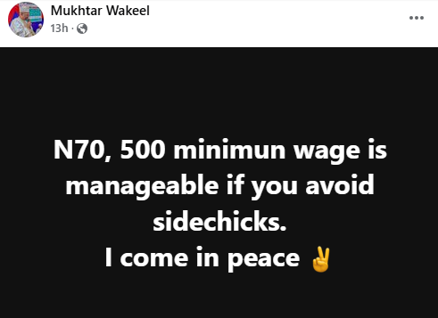 “N70, 500 minimum wage is manageable if you avoid side chicks. I come in peace,” he wrote.