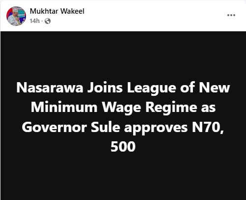 He stated this on Saturday after the Nasarawa State Government reportedly approved N70,500 as new minimum wage for state workers.