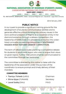 The leadership of National Association of Nigerian Students (NANS) Southwest (Zone D) has appointed twenty students across tertiary institutions in the southwest as Planning Committee of Southwest Maiden Inter Tertiary Debate Competition.