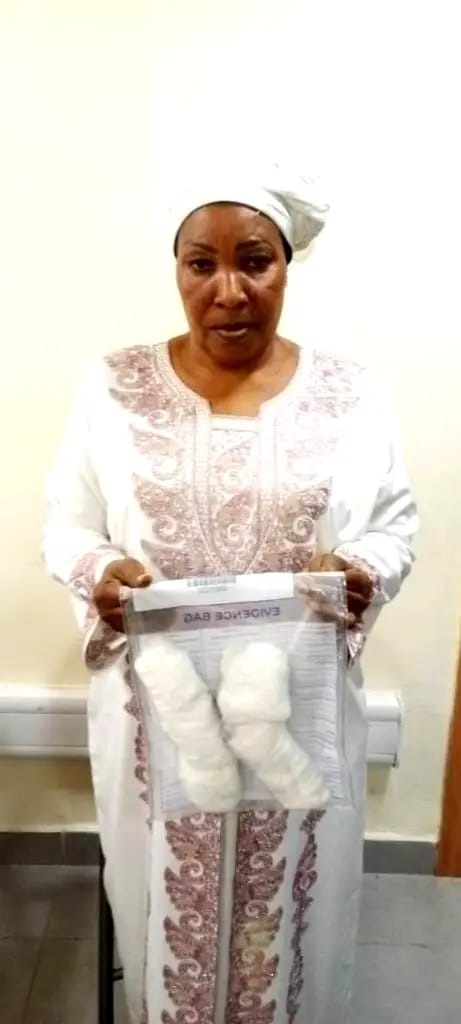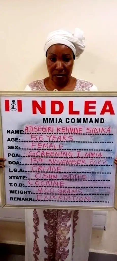 Operatives of the National Drug Law Enforcement Agency, NDLEA, have arrested a 56-year-old widow and mother of four, Mrs. Ajisegiri Kehinde Sidika at the Murtala Muhammed International Airport, Ikeja, Lagos for attempting to traffic 400grams of cocaine concealed in her footwear to Makkah, Saudi Arabia.