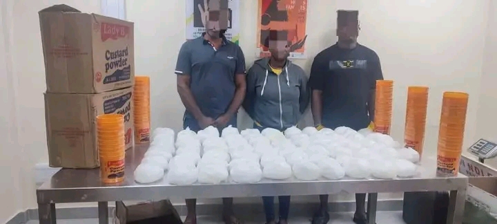 The National Drug Law Enforcement Agency has arrested a freight agent, Nwobodo Chidiebere; a female suspect, Chioma Lucy Akuta; and the drug man behind the shipment, Charles Ezeh, with large methamphetamine drug concealed in powdered custard containers as part of a consolidated cargo going to London, United Kingdom at the SAHCO export shed of the Murtala Muhammed International Airport, Ikeja Lagos.