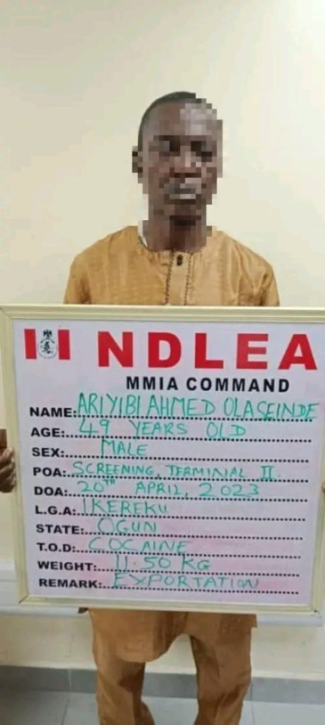 “Ariyibi was intercepted on Thursday 20th April at the screening point of MMIA Terminal 2 during outward clearance of Qatar Airways passengers travelling from Lagos via Doha to Medina, Saudi Arabia. When his carry-on bag was checked, four sets of white lace material with linings of substance that tested positive to Cocaine weighing 11.50kg were discovered.