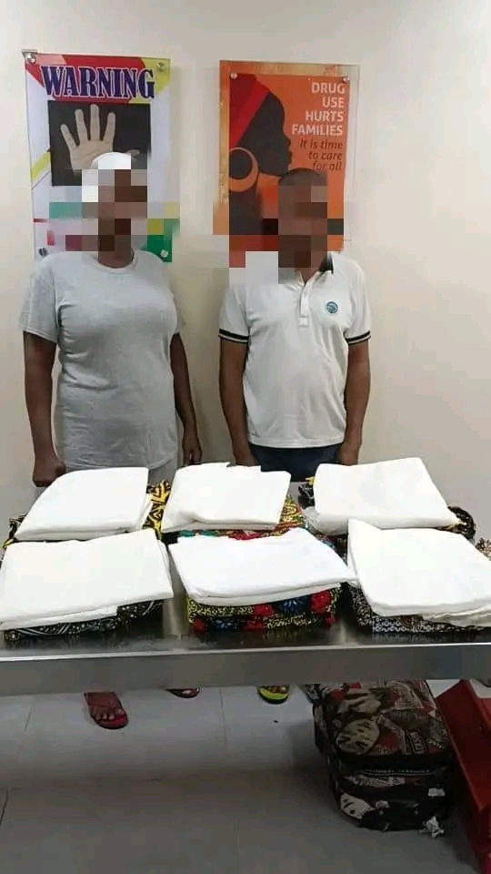 The statement partly read, “A widower, Ariyibi Ahmed Olaseinde and a divorcee, Akanbi Silifat Tunrayo who were going for lesser hajj in Saudi Arabia have been arrested by operatives of the National Drug Law Enforcement Agency, NDLEA, at the Murtala Muhammed International Airport, MMIA Ikeja Lagos for attempting to export 14.4 kilograms of cocaine concealed in lace and ankara fabrics.