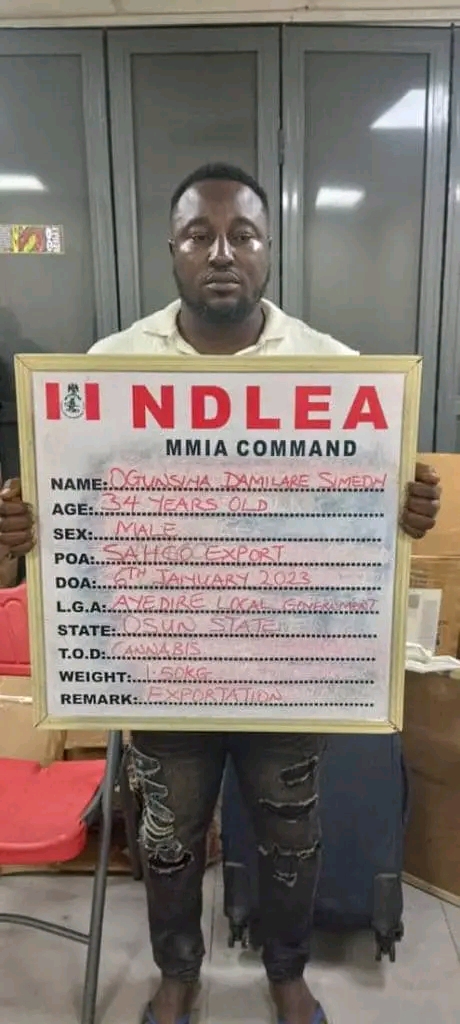 “At the Lagos airport, a freight agent Ogunsina Damilare was arrested on Friday 6th January following a bid to export 1.5 kilograms of skunk hidden in foodstuffs to Dubai, UAE through the SAHCO export shed of the MMIA, while a similar attempt to ship 11.5kgs of the same substance to the United Kingdom was frustrated when the consignment concealed in a giant wooden sculpture was intercepted by NDLEA operatives of the Directorate of Operations and General Investigations (DOGI) at a courier company in Lagos. Curiously, the latter emanated from Ghana with London as destination.
