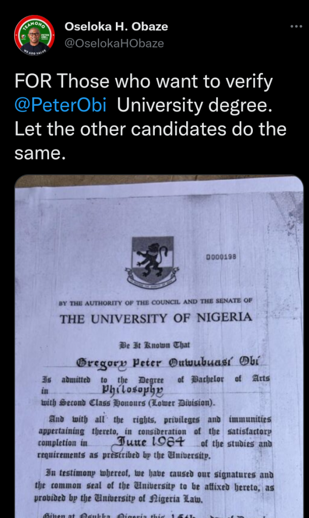 Degree certificate of the presidential candidate of the Labour Party, LP, Peter Obi, has surfaced online.