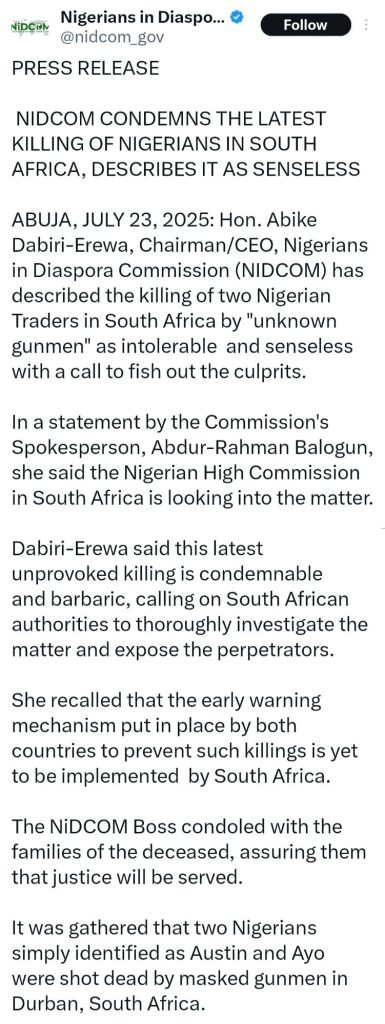Abike Dabiri-Erewa, Chairman/Chief Executive Officer, Nigerians in Diaspora Commission (NiDCOM), has reacted to the k!lling of two Nigerian traders in South Africa by gunmen.