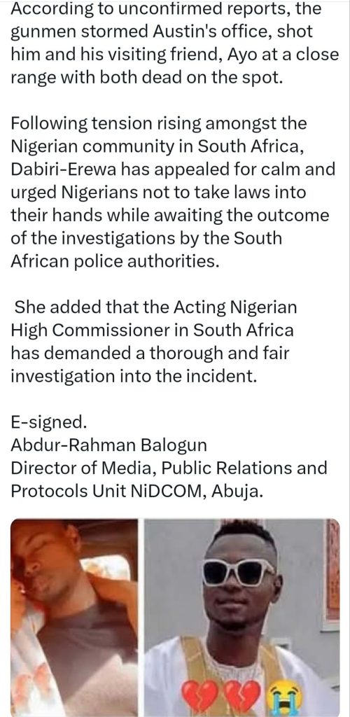 Dabiri-Erewa, in a statement by NiDCOM spokesperson, Abdur-Rahman Balogun, disclosed the Nigerian High Commission in South Africa was looking into the matter.