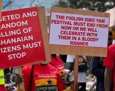 The protest was tagged “Nigeria Must Go”. Protesters held placards making accusations against Nigerians and asking that they be deported from Ghana.