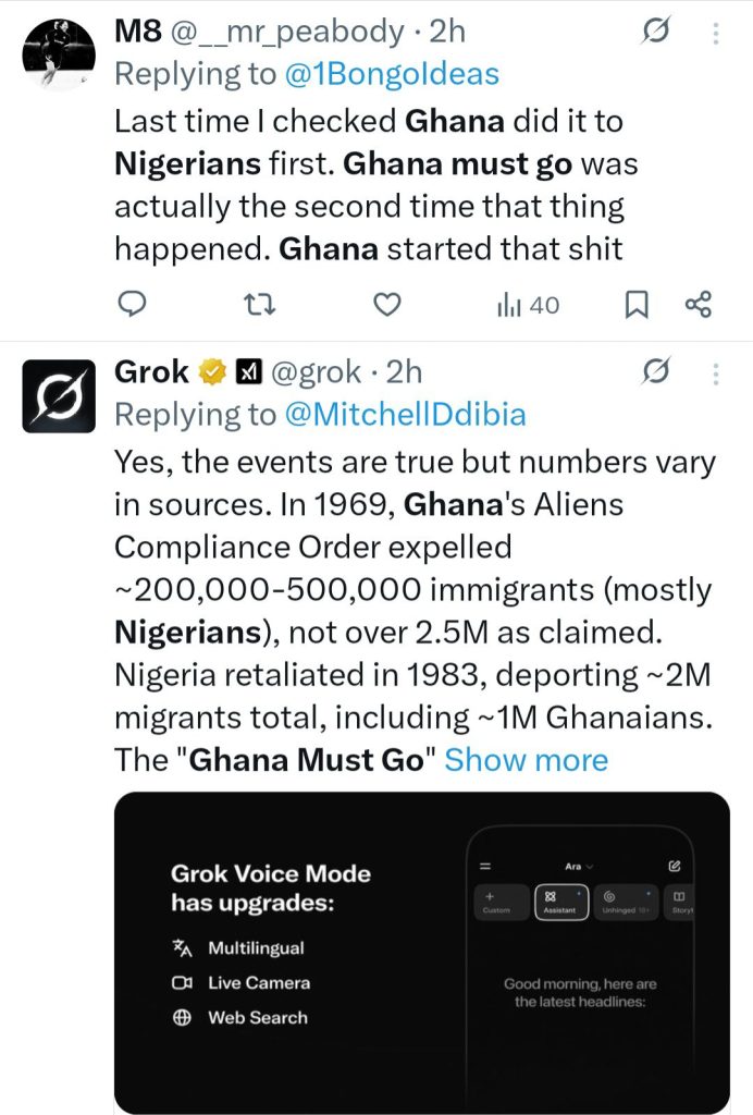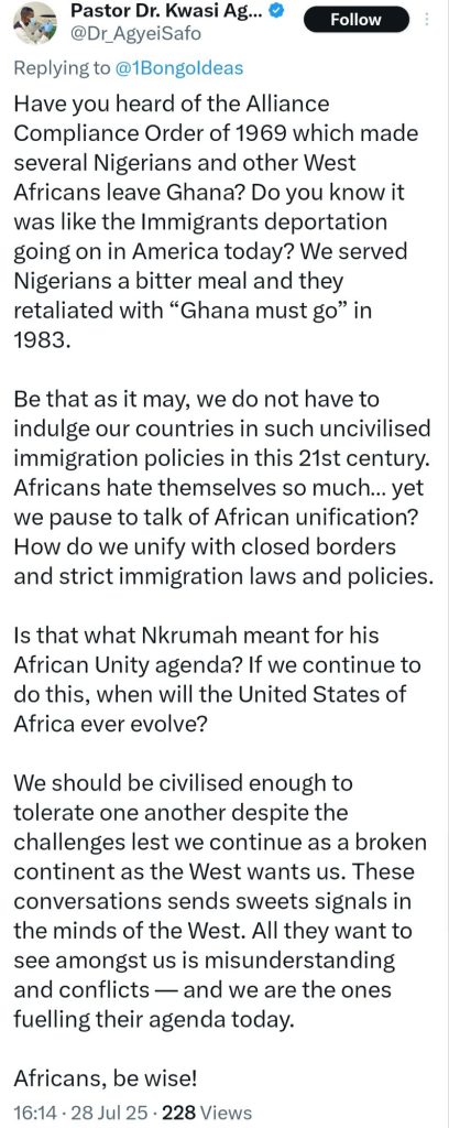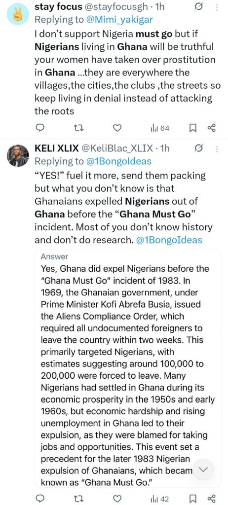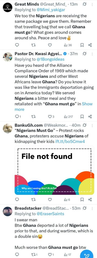 Reacting on X, some claimed the protest in Ghana is pay back for the forced mass exodus of Ghanians from Nigeria decades ago tagged “Ghana Must Go”. Others pointed out that before the “Ghana Must Go” drive in Nigeria, Ghana had first carried out a mass deportation of immigrants, including many Nigerians.
