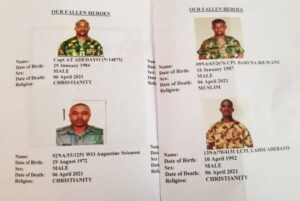 The soldiers were killed on April 6, 2021, by bandits while on a routine operational task to maintain peace in the troubled region of Konshisha and Oju Local Government Areas of the state.