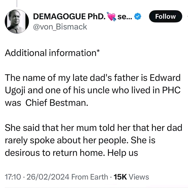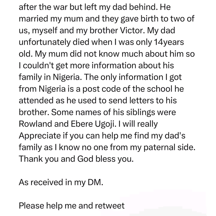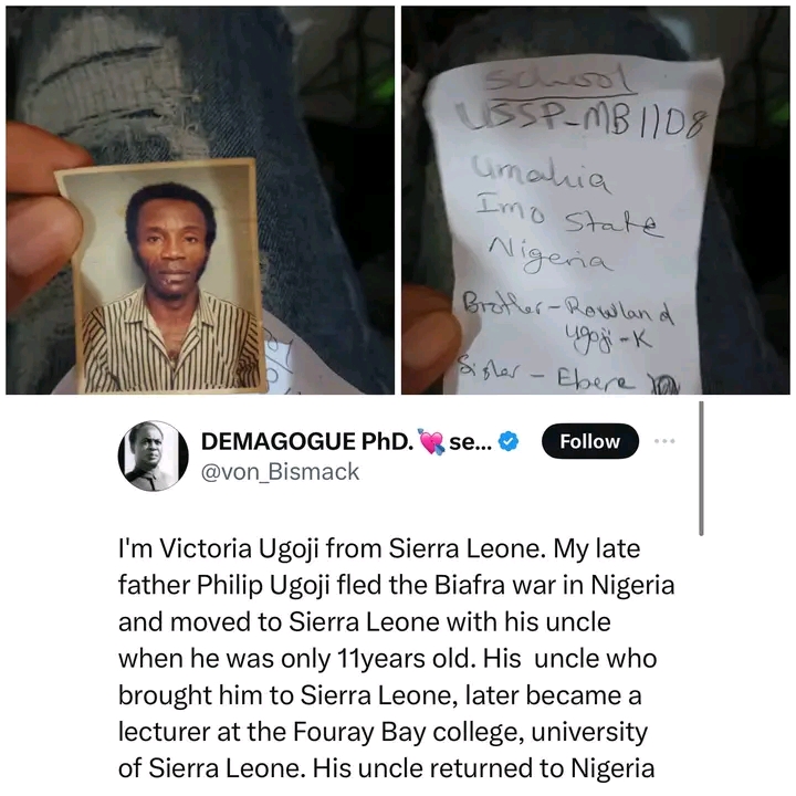 A Nigerian lady whose deceased father fled to Sierra Leone during the civil war takes to social media to search for his family members.
