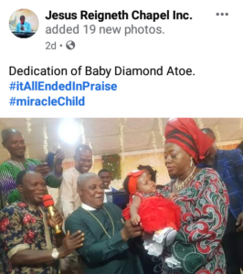 The dedication of Baby Diamond was held on Saturday, February 20, 2021, at Jesus Reigneth Chapel, Idanu street, Upper Ekehuan Road in Benin City.