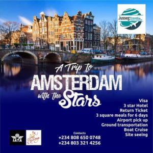 In a telephone interview with our correspondent, the media consultant to the agency, Adekunle Abolade (Dodoede) said “A Trip to Amsterdam With The Stars” come with packages like Visa, 3 Star Hotel, Return Ticket, 3 square meals for 6 days, Airport pick up, Ground Transportation, boat Cruise and site seeing.
