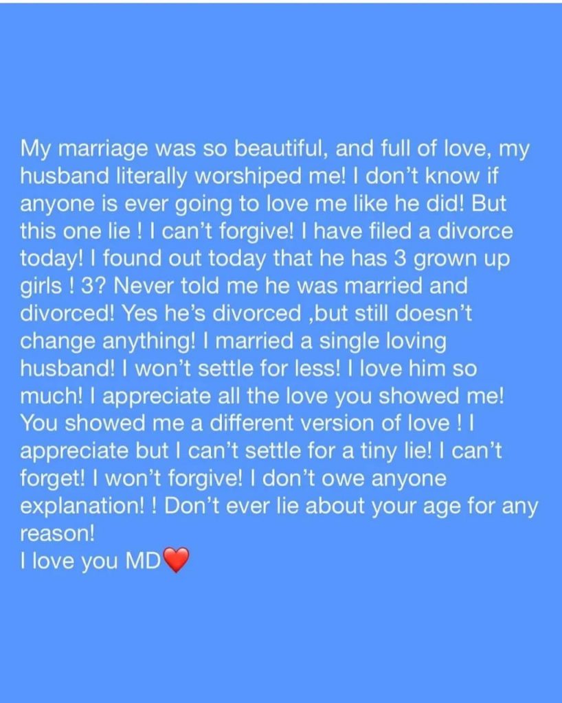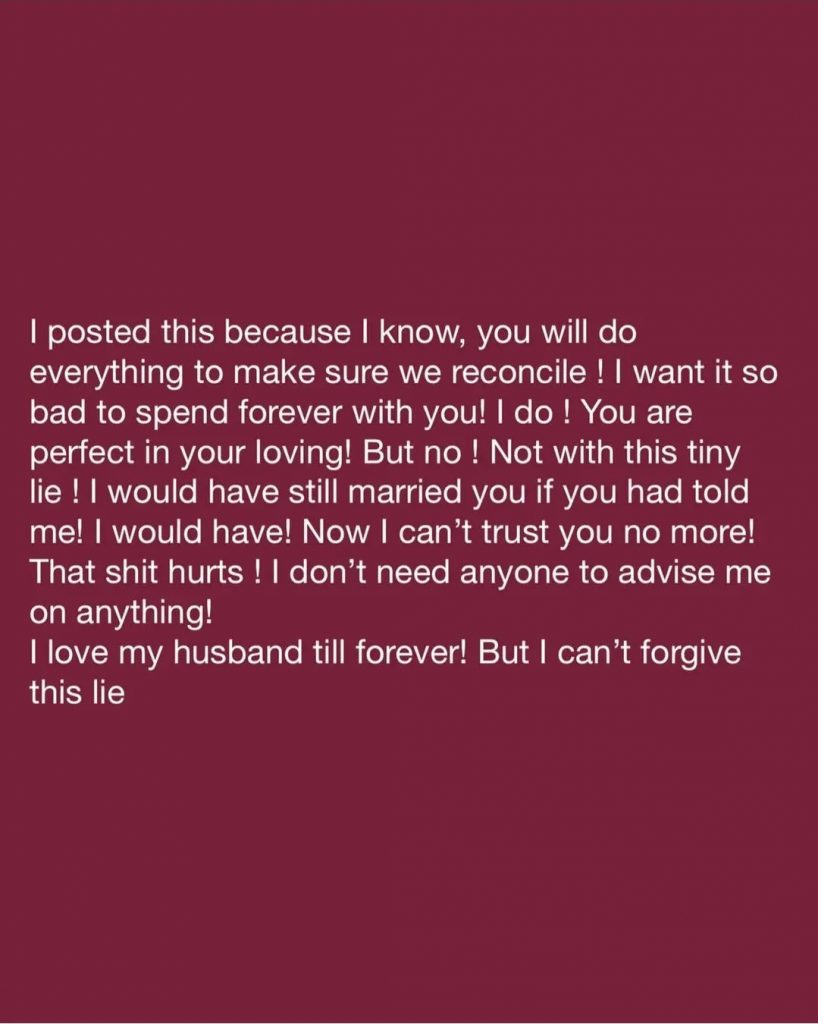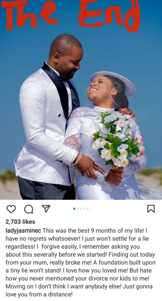 She wrote: “This was the best 9 months of my life! I have no regrets whatsoever! I just won’t settle for a lie regardless! I forgive easily, I remember asking you about this severally before we started! Finding out today from your mum, really broke me! A foundation built upon a tiny lie won’t stand! I love how you loved me! But hate how you never mentioned your divorce nor kids to me! Moving on I don’t think I want anybody else! Just gonna love you from a distance!”