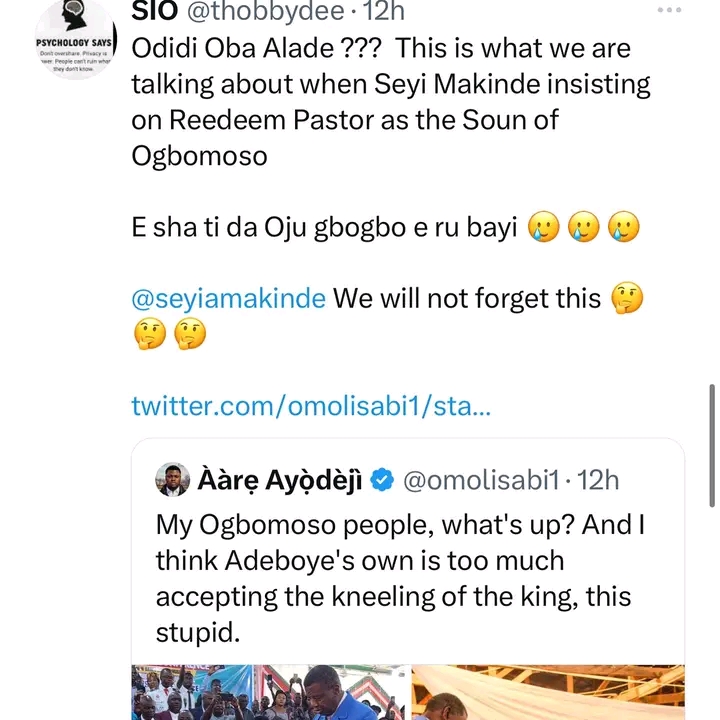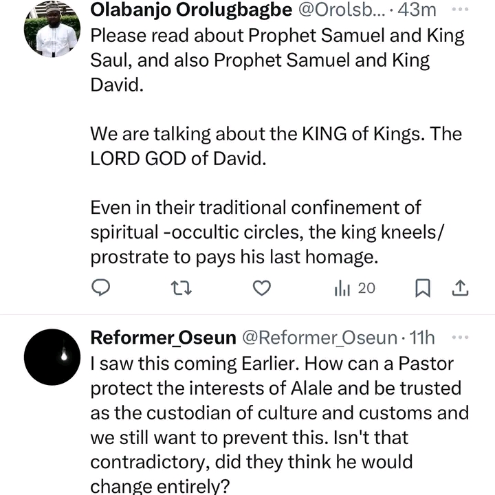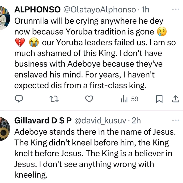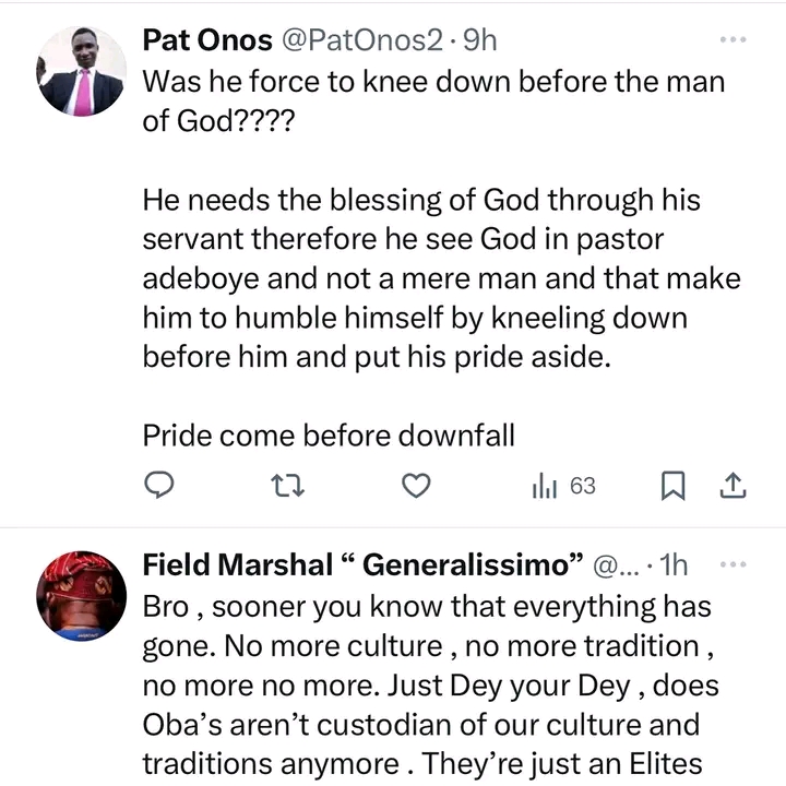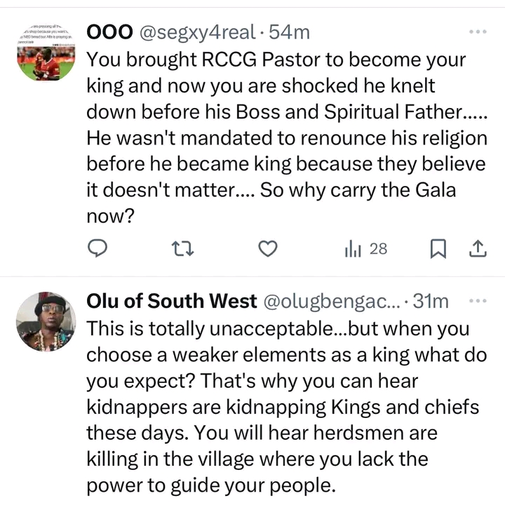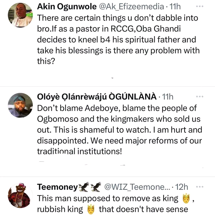 While some Nigerians do not see anything wrong in the king kneeling before Adeboye who they say represents the king of kings, others argue that as a King, he is not expected to knee before anyone else.