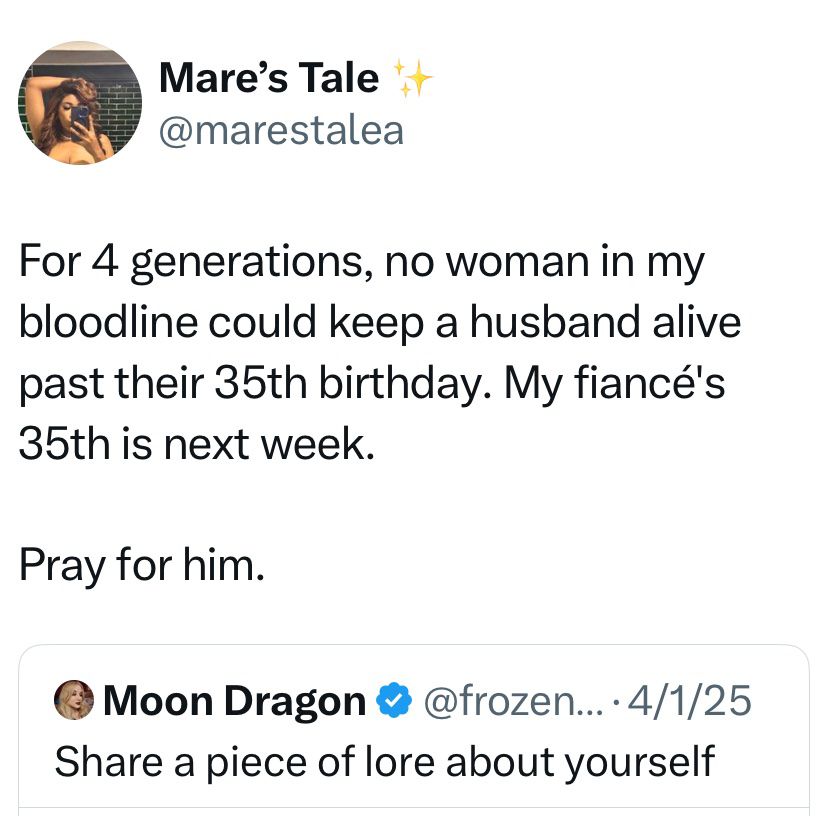 “For 4 generations, no woman in my bloodline could keep a husband alive past their 35th birthday. My fiancé’s 35th is next week. Pray for him,” she wrote.