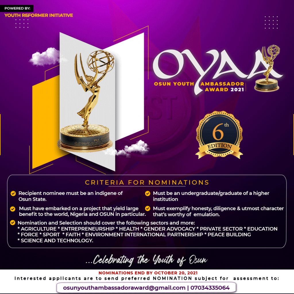 The nomination for the 6th edition of the Osun Youths Ambassador Award has been released.