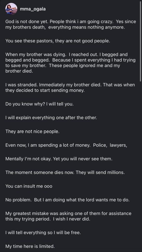 Nollywood actress, Doris Ogala has taken to social media to share a disturbing account of her life since the death of her brother, alleging that certain pastors abandoned her in her time of need.