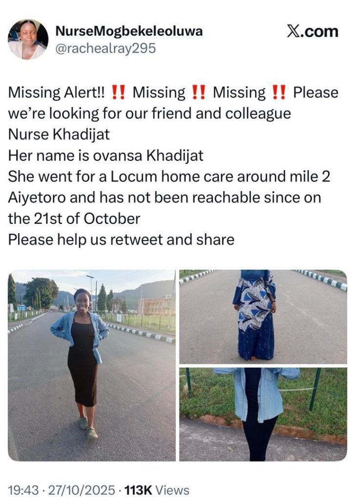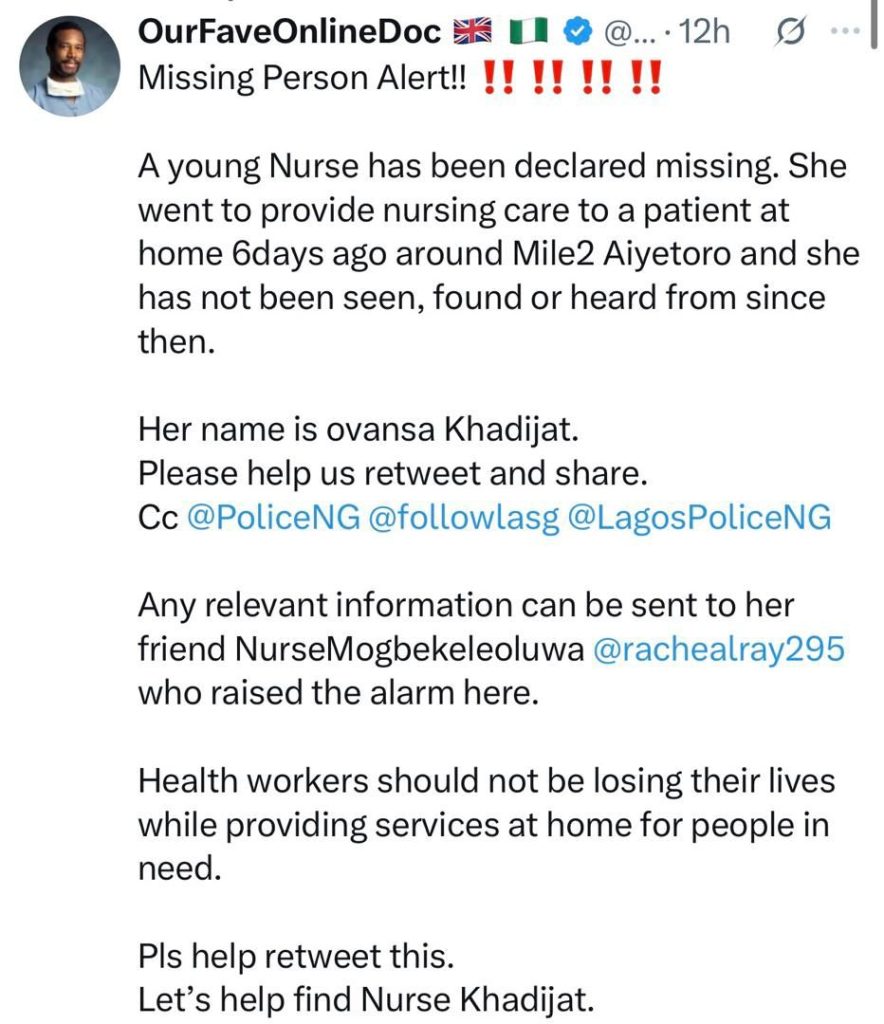 A Nigerian nurse, Ovansa Khadijat, has been declared missing after she left her home  to attend to a patient in the Aiyetoro area of Ogun state.