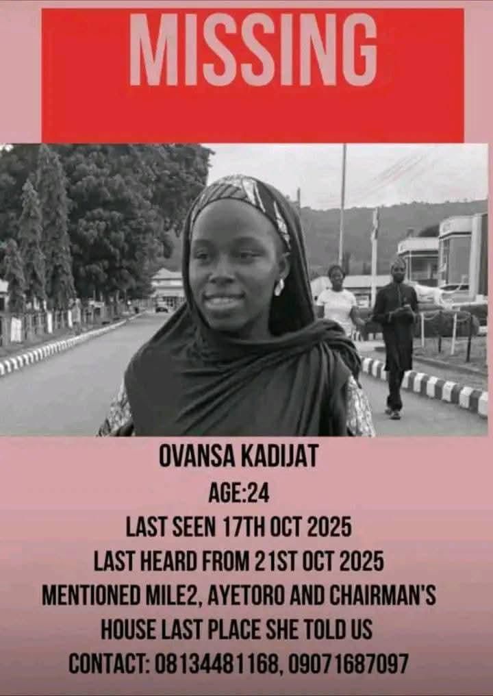 According to Joy, Khadijat boarded a cab from the Mile 2 area of Lagos to Aiyetoro in Ogun state, but has not been heard from or seen since then.