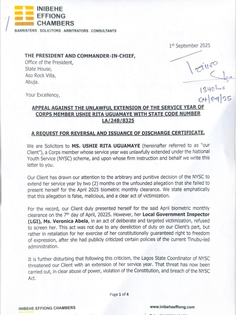 The petition, titled “Appeal Against the Unlawful Extension of the Service Year of Corps Member Ushie Rita Uguamaye with State Code Number LA/24B/8325,” reads in part: