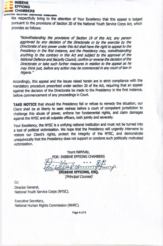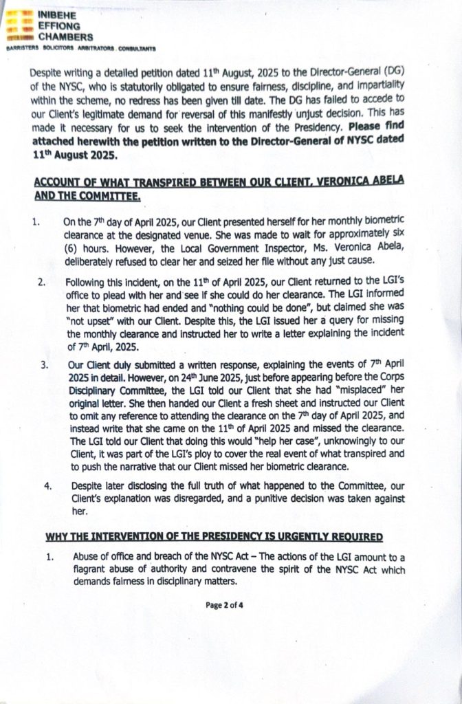 “Despite writing a detailed petition dated 11th August, 2025 to the Director-General (DG) of the NYSC, who is statutorily obligated to ensure fairness, discipline, and impartiality within the scheme, no redress has been given till date. The DG has failed to accede to our Client’s legitimate demand for reversal of this manifestly unjust decision. This has made it necessary for us to seek the intervention of the Presidency. Please find attached herewith the petition written to the Director-General of NYSC dated 11th August 2025.”