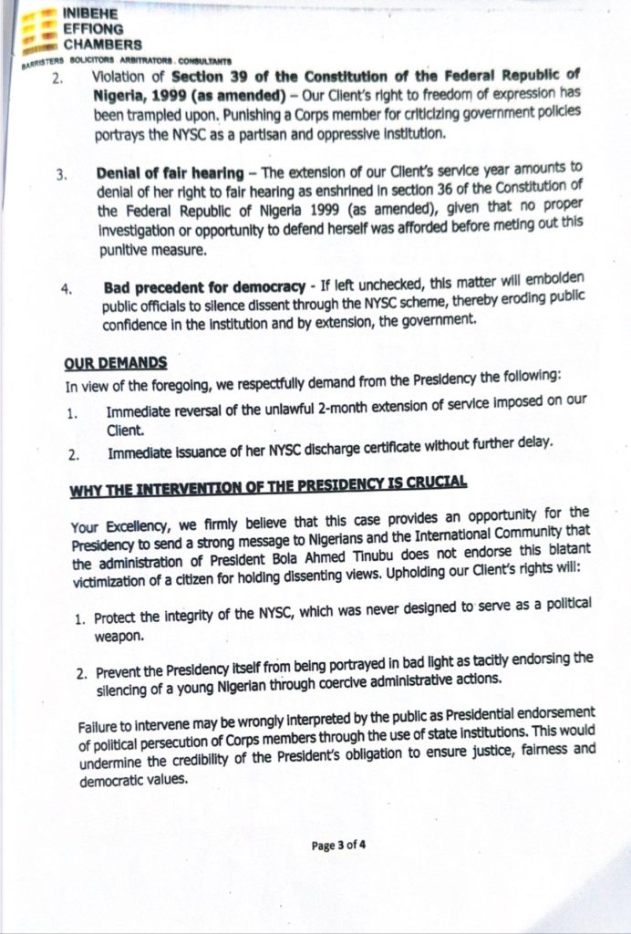 “Our Client has drawn our attention to the arbitrary and punitive decision of the NYSC to extend her service year by two (2) months on the unfounded allegation that she failed to present herself for the April 2025 biometric monthly clearance. We state emphatically that this allegation is false, malicious, and a clear act of victimization.