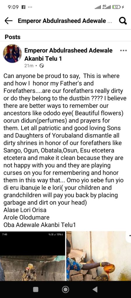Oba Akanbi advised that Yorubas should replace unkempt shrines with more decent and organized symbols that reflect beauty, purity, and respect for the forefathers.