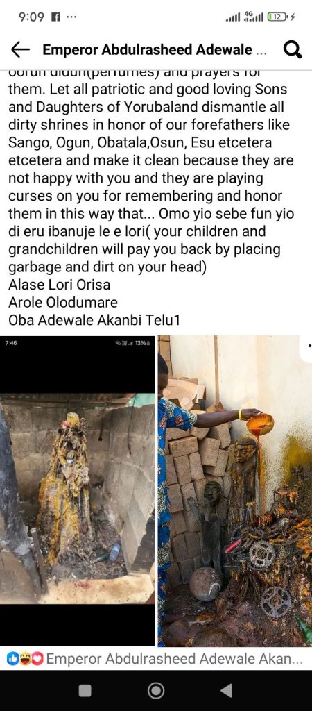 The Oluwo of Iwo, Oba Abdulrasheed Adewale Akanbi, has urged sons and daughters of Yorubaland to dismantle dirty shrines dedicated to deities such as Sango, Ogun, Osun, and others, describing such practices as unbefitting ways to honor their ancestors.