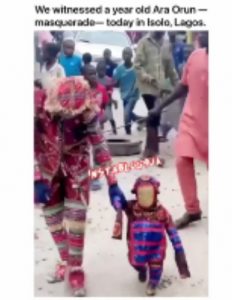 One-Year-Old Masquerade Spotted In Lagos (Photo, Video) August 22, 2021 amiloaded News 0 Share on Social Media x facebook linkedinwhatsapptelegramA one-year-old Ara Orun masquerade was spotted in Isolo, Lagos.Watch Video: Share on Social Media x facebook linkedinwhatsapptelegram