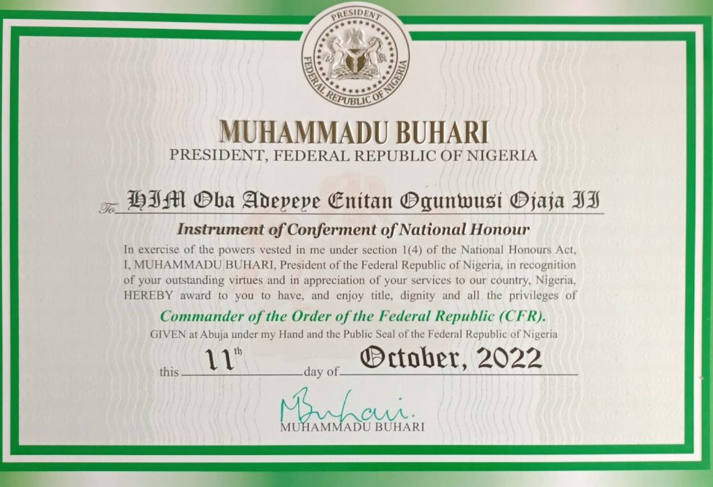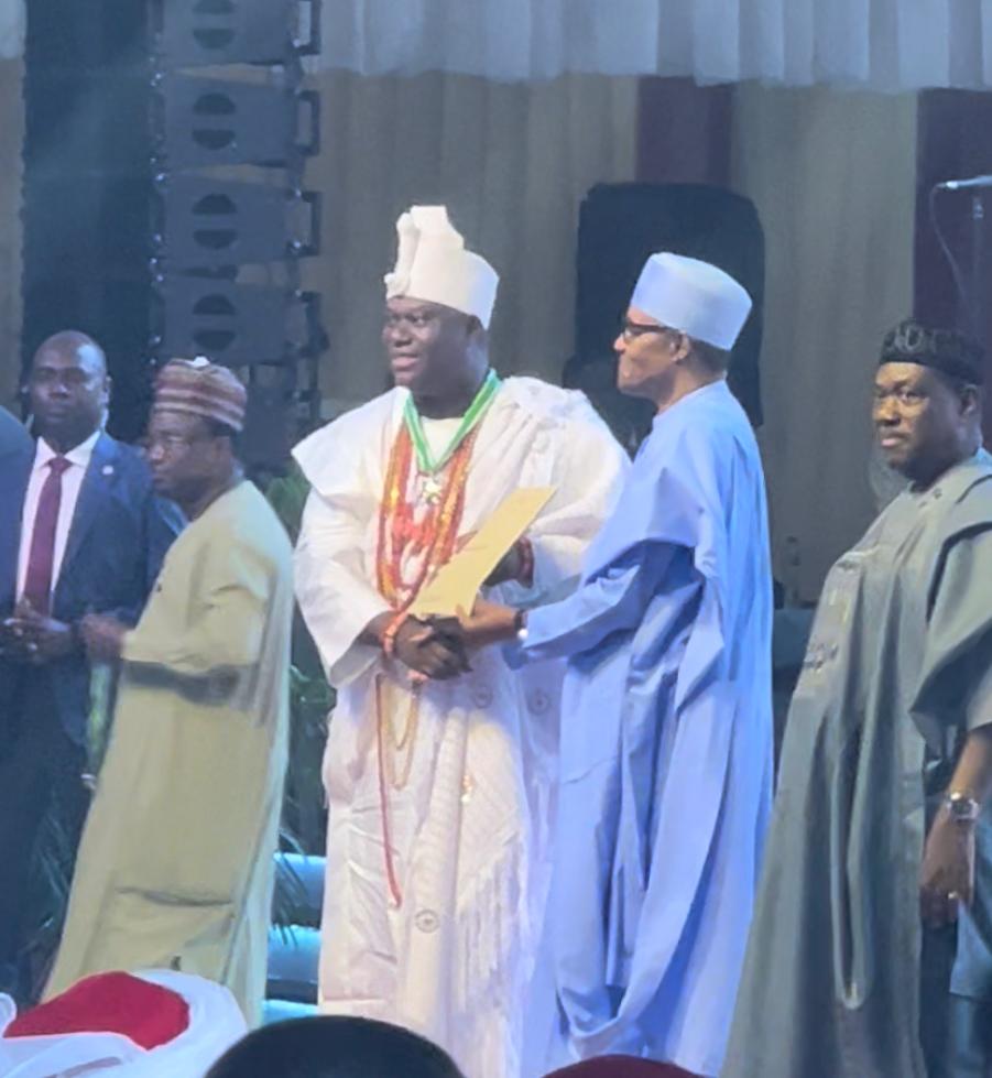 Ooni Ogunwusi, Natural Head of the Oduduwa race worldwide who doubles as Co-chairman, National Council of Traditional Rulers of Nigeria (NCTRN) was described while being decorated by President Buhari as a great advocate of Youth and Women Empowerment, a passionate Promoter of Peace and Unity in Africa and an exemplary selfless leader relentlessly doing his best preserving the cultural values of the African people, while Senate President Lawan was honoured in recognition of his unquantifiable contributions to nation building through the legislature.